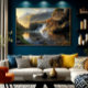 Um vale majestoso banhado pela luz dourada do sol, onde uma cachoeira cai em véus suaves sobre rochas antigas, refletindo em águas cristalinas. Árvores de outono e picos nevados completam essa sinfonia natural de poder, paz e beleza eterna.