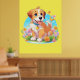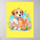 Um poster com uma fotografia de um filhote fofo sentado entre as flores. Ele parece muito feliz por estar cercado por flores e borboletas. O presente perfeito para dar àqueles que amam cachorros. Contém conteúdo generativo.