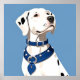 Ilustração estilizada de um cão Dalmático vestindo um colar azul contra um fundo azul comum, destacando sua aparência distinta e comportamento amigável.