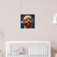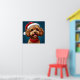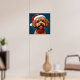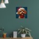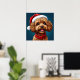 Cachorro alegre e fofinho usando um chapéu festivo de Papai Noel vermelho com acabamento branco e um cachecol vermelho combinando em volta do pescoço. O pelo encaracolado do cachorro é de uma cor quente e dourado-marrom, e seus olhos grandes e expressivos transmitem uma sensação de alegria e brincadeira. O fundo é de um azul profundo, que realça as cores vibrantes dos acessórios do cachorro. No geral, a imagem tem um clima caprichoso e festivo, perfeito para a época de Natal.