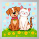 Uma ilustração alegre de um cão e gato amigável sentados juntos na grama verde cercado por flores e corações coloridos, simbolizando amizade e felicidade.