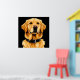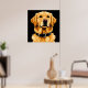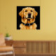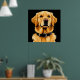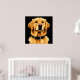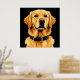 Ilustração vívida de um retriever dourado usando uma coleira preta contra um fundo escuro. Destaca a expressão amigável do cão e a textura distinta do pelo, encapsulando calor, lealdade e companheirismo.