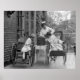 Foto antiga de meninas (uma com uma boneca antiga) em cadeiras de rodas mais velhas com enfermeira ouvindo rádio no Hospital Infantil.