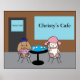 Um cachorro marrom giro vestindo uma camisa listrada e um bereto azul junto com um cachorro de poodle rosa e branco sentado e apreciando um croissant e um macarão junto com um café fora de um café. O texto na porta e nas janelas são personalizáveis e podem ser alterados para o ajustado de suas necessidades!