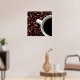 Fotografia de uma xícara de café branca com café preto, contra fundo de café.