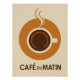 L’affiche représente une grande tasse de café stylisée, vue de dessus, en aplat de brun moka sur fond crème légèrement texturé. Une volute de vapeur s’élève en spirale, tracée par une ligne continue ocre, évoquant les courbes d’un logo rétro. En arrière-plan, un cercle soleil orange brûlé encadre la tasse, comme pour souligner la chaleur matinale. La typographie, fine et arrondie, est placée discrètement en bas : Café du matin en capitales arrondies, couleur caramel foncé. L’ensemble évoque une ambiance nostalgique des années 60, avec une palette réduite mais chaleureuse : brun, crème, orange, ocre.