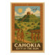 Poster de viagens retrô de Cahokia, a antiga cidade nativa americana perto do rio Mississippi. Primeiro plano: a icônica ascensão dos Monges, majesticamente, com grama verde aterrorizada e estruturas de madeira no topo. Meio-chão: montanhas cerimoniais menores, cercas de palisadas de madeira e pessoas em trajes Mississípianos tradicionais (penas, tecidos tecidos) que caminham ou se reúnem