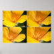A imagem é uma colagem de quatro fotos de close-up de uma papoila da Califórnia. A flor tem pétalas amarelas brilhantes e um aglomerado de estames laranja no centro. O fundo está turvo, com pistas de folhagem verde. A iluminação é macia e natural, destacando a delicada textura das pétalas. O humor geral é brilhante e alegre, enfatizando a beleza da flor.