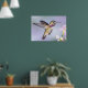 Poster cor-de-rosa e púrpura apresentando um belo beija-flor-chata voando sobre flores de lantana amarelas e cor-de-rosa, mostrando suas asas completamente estendidas no dorso e suas iridescentes penas magenta de garganta. Bonita e única decoração de parede para beija-flor, jardim e amantes da natureza. Diversão: este beija-flor é o menor pássaro da América do Norte e é nomeado a partir da musa Calliope na mitologia grega. Foto tirada em Pasadena, Califórnia.