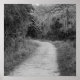 Foto preta e branca de um caminho de sujeira que se enfileira através de uma área arborizada