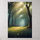 Uma pintura digital representa uma cena serena de floresta com um caminho enrolamento que vai até a distância. O caminho é banhado em luz quente do sol que flui através da densa copa de árvores, lançando longas sombras sobre a luxuosa grama verde. O ar está cheio de uma névoa etérea macia, acrescentando à atmosfera mística.