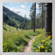 Uma cena pacífica e pitoresca da natureza, com um caminho de sujeira a enrolar por uma floresta de pinheiros, cercada por flores silvestres amarelas vibrantes. As árvores verdes altas esticam-se em direção ao céu, e a trilha leva em direção a montanhas distantes sob um céu azul brilhante com nuvens brancas lisas. As flores silvestres ouros adicionam um contraste alegre à paisagem verde, criando um humor calmo e refrescante. Ideal para amantes da natureza, caminhantes, e qualquer um que aprecie beleza cênica ao ar livre.