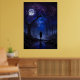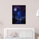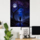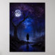 Uma obra de arte assombrosa captura a essência da solidão como uma figura solitária atravessando uma floresta escura iluminada pelo brilho etéreo de uma lua de cheio. Os ramos retorcidos e esqueletais das árvores mortos criam um ambiente macabro, lançando sombras inquietantes no caminho. O céu acima é uma canvas celeste adornada com inúmeras estrelas, acrescentando um toque de mistério cósmico à cena. O homem solitário, cercado pela melancolia silenciosa da natureza, evoca um sentido de contemplação e introspecção.