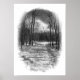 Este poster apresenta uma cena de vitória em preto e branco. Um longo caminho de neve leva da floresta até um lago gelado coberto de neve. Os troncos de árvore preta nu nus enquadram a imagem. Um céu dramático de cinzas com nuvens brancas brilhantes ilumina a clareira distante.