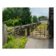 Um caminho rústico e convidativo em Mytholmroyd, Calderdale, West Yorkshire, emoldurado por uma cerca de madeira à esquerda e um portão de metal tradicional à direita, levando à escondida Ponte Hawksclough. O caminho está parcialmente coberto de grama verde e flores silvestres, indicando uma rota natural menos percorrida. Ao fundo, a densa e vibrante folhagem verde das árvores e arbustos caracteriza a paisagem Pennine. Um vislumbre de um edifício de pedra tradicional e uma cerca branca pode ser visto mais adiante, sugerindo o ambiente rural pacífico. A cena evoca uma sensação de descoberta e o charme do campo inglês. Esta imagem pode ser editada e transferida para vários produtos de sua escolha.