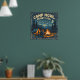 This vintage-inspired outdoor poster captures the quiet magic of a night in the woods. A lone camper sits beside a glowing campfire beneath towering pine trees and a star-filled sky, rendered in flat illustrative shapes with a classic, woodblock-style aesthetic. Muted blues and deep night tones balance the warmth of firelit oranges, while a worn ink texture adds authentic, timeworn character. Arched above the scene, the message “Camp More. Worry Less.” serves as a gentle reminder to slow down, unplug, and reconnect with nature. Perfect for cabins, campers, studios, or anyone who feels most at home under the stars.