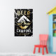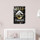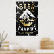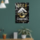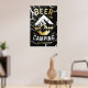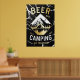 Uma ilustração gráfica de design sobre um fundo de mármore preto com uma paisagem de montanha, tenda, lua e estrelas numa estrutura de diamante de ouro que lê Cerveja e Camping Go Together.