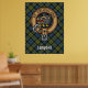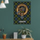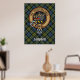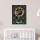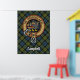 Crachá da crista Campbell rodeado por uma correia e fivela sobre fundo tartano. Texto personalizado.