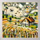 Uma abstrato de um celeiro no meio de um campo de trigo. A cor principal é amarela.