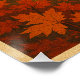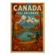 Poster de viagens vintage do Canadá no outono. Primeiro plano: uma floresta serena mapeada com folhas vermelhas, laranja e ouro-amarelas carpetando o chão.