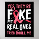 Essa engraçada design de conscientização do cancer mama lê "sim, eles são falsos, meus verdadeiros tentaram me matar". Foi criado com amor e você verá uma fita rosa e uma recuperação.