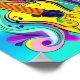 Uma brilhante canvas de aqua, blues e rosa foi criada usando guitarras como foco. Combinar as cores brilhantes e as guitarras dá uma sensação de aventura.