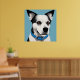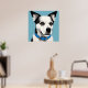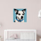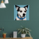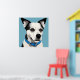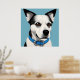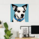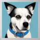 Ilustração de um cachorro preto e branco vestindo uma coleira azul contra um fundo azul claro, exibindo uma expressão calma e atenta, destacando o comportamento suave do cachorro e a aparência charmosa.