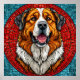 Ilustração colorida e artística de um cão São Bernardo, apresentando um fundo vibrante com um padrão de mosaico circular vermelho. A expressão do cão é feliz, mostrando sua pelagem e características faciais proeminentes.