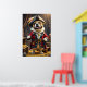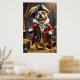 Esta imagem encantadora apresenta um Bulldog Francês branco e bronzeado, vestido na verdade como capitão pirata, completo com um chapéu tricórnio e um elaborado casaco vermelho, enfeitado com trim azul escuro e sotaques dourados brilhantes. O distinto canino mantém-se confiante com uma pata num peito fechado do tesouro, rodeado por moedas de ouro dispersas. Sua expressão brincalhona adiciona personalidade a este retrato aventureiro e real.