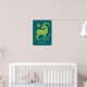 Poster em uma representação estilizada de uma cabra, intricadamente decorada com padrões de verde e amarelo, representando o signo zodíaco Capricórnio. Os elementos circundantes incluem símbolos celestes e designs de folhas.
