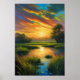 Numa obra-prima de arte digital que emula a rica textura da pintura a óleo, uma incrível paisagem ganha vida. Um campo verde e pantanoso é transformado pela adoção de um pôr do sol que respira. O céu é pintado em tons de ouro e âmbar, lançando um brilho quente que banha a paisagem à luz etérea. A serenidade do campo é animada pela interação de cores, criando um quadro mesmerizante que captura a essência da beleza da natureza.