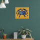Gravação de madeira de caranguejo azul, em azul, sobre fundo amarelo.