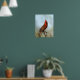 Um cardeal Norte vermelho brilhante, gravado num membro morto. O retrato tem um fundo azul e primavera verde mudo.