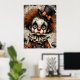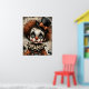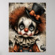 Carnaval rachado - A Poster de Mascarada Melancolia Uma criança amargurada de palhaço olha através dos olhos ocos, sua face pálida pintada com dramática maquiagem negra e uma expressão fraturada. Derramares de cabelo Frizzy auburn por baixo de um chapéu preto adornado com um arco laranja, enquanto um colarinho rufado arma uma fantasia vintage em tons desbotados de laranja e azul. Ao redor da figura estão abóboras fantasmas e fragmentos de texto envelhecido, evocando uma nostalgia assombrada. Os hums de composição com profundidade emocional e elegância estranha — onde o capricho encontra o cansaço, e cada crack conta uma história.
