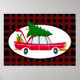 Um poster com um carregando vermelho legal, um pinheiro de natal verde no telhado e um presente guardado no tronco aberto. Tem um belo estilo retro-anos 50. Fundo da xadrez de búfalo vermelha.