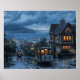 Experimente o charme de São Francisco no crepúsculo com esta poster. Dois carros a cabo deslizam por uma rua derrubada pela chuva, flanqueados por casas vitorianas com janelas brilhantes, enquanto Alcatraz se aproxima da baía sob nuvens dramáticas. Ideal para amantes da arte urbana, entusiastas da paisagem urbana e como uma decoração ou dádiva caseira única.