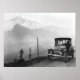 A Detroit Electric indo de Seattle para o Monte Rainier. Repro de uma foto antiga de um carro elétrico muito antigo na estrada montanha do Estado de Washington. Fotografia tirada em 1919. Meio original LOC: impressão fotográfico.