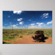 Pintura digital de um carro enferrujado no vasto deserto da Arizona. O carro se senta em primeiro plano com a escova e o deserto se esticando no horizonte. Os postes telefônicos alinham o estado no fundo.