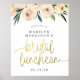 Um belo cartão de boas-vindas com "bem-vinda" em texto curvo, sobre o nome da noiva; "almoço de noiva" está escrito abaixo em letras douradas falsas. A data aparece abaixo em números itálicos. No topo deste cartaz, há um buquê de flores e folhagens pintadas à mão em aquarela sobre uma chuva de brilho dourado. Veja o link da coleção nesta página ou visite nossa loja para mais!