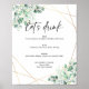 Pôster de Menu de Bebidas Geométrico de Eucalipto Verde. Caracteriza folhas de eucalipto pintadas à mão e uma moldura geométrica dourada. A frase 'vamos beber' não é editável.