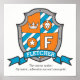 Letra F em estilo de crista de escudo de cavaleiros arte de monograma de nome pôster perfeito para o quarto ou sala de jogos de um menino em tons de laranja, azul-teal, branco e cinza. Personalize com o nome da criança e o significado do nome para um toque personalizado no quarto ou berçário da criança, este exemplo é para o nome Fletcher O fabricante de flechas Dinâmico, aventureiro e enérgico. Impressão de pôster ideal como presente para um menino recém-nascido, batizado, nomeação de bebê, aniversário de menino ou presente de chá de bebê. Desenho único de escudo de heráldica arte gráfica e design por Sarah Trett. www.sarahtrett.com para www.mylittleeden.com