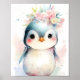 Desenho de pinguim fofo em cores pastéis suaves com elementos florais.