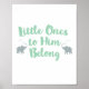 Um cartaz de berçário cristão fofo com uma linha do hino infantil popular Jesus Me Ama. O design tipográfico tem a frase "pequenos lhe pertencem" em fonte de letra pincel verde menta e dois elefantes cinzas.