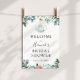 É hora do chá com a noiva! Dê as boas-vindas aos convidados para o seu chá de panela com este lindo cartaz, apresentando um bule de chá branco aquarelado rodeado por folhagens, eucalipto e flores cor-de-rosa. Personalize com suas informações ou clique em "Clique para personalizar ainda mais" para editar os estilos de fonte, tamanho e cores.
