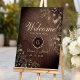 Dê as boas-vindas aos convidados para o seu casamento country vintage com nosso cartaz de boas-vindas em madeira rústica elegante. Adornado com rendas florais boho douradas gildadas intrincadas e personalizado com o monograma da noiva e do noivo, ele define o tom para uma celebração encantadora em meio à beleza da natureza.