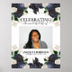 Um sinal de boas-vindas de funeral com rosas florais em azul-marinho e branco com folhagem verde e sotaques de dourado falso, uma fotografia de seu ente querido, seu nome e datas.