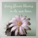 Cartaz de frase inspiradora. Cartaz de cada flor que floresce no seu próprio tempo. Cartaz de citação motivacional decorado com uma imagem de um cacto com uma flor pálida rosa a branca em plena floração.