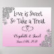 Cartaz de Candy Bar rosa e preto texto Love is Sweet fofo para casamento ou chá de bebê.