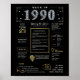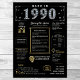 Entre no ano de 1990 com nosso cativante pôster digital de aniversário, repleto de fatos históricos, eventos significativos e narrativas fascinantes do passado. Adornado com elegantes acentos dourados e prateados contra um fundo preto impressionante, este pôster de aniversário emana charme atemporal.