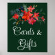 Este sinal de cartões de casamento de Natal e presentes apresenta uma bela aquarela de flores de poinsettia vermelhas e folhas de pinheiro para as festas de fim de ano. Cartaz de casamento de inverno elegante em verde para um evento de Natal. Decoração de recepção floral de poinsettia bonita.